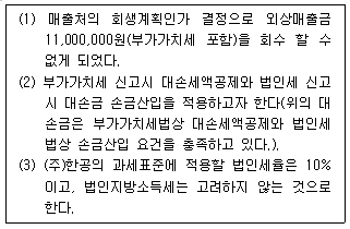 다음은 부가가치세 과세사업자인 (주)한공의 대손관련 자료이다. 이를 토대로 계산한 부가가치세 세액과 법인세 세액에 미치는 영향의 합계금액은 얼마인가?