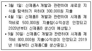 다음은 (주)한공의 2019년 연구개발 관련 지출거래 내역이다. (주)한공이 2019년 12월 31일 재무제표에 자산으로 표시할 금액은 얼마인가? (단, 무형자산의 내용년수는 5년, 잔존가치는 없으며 상각방법은 정액법, 월할상각을 가정한다.)