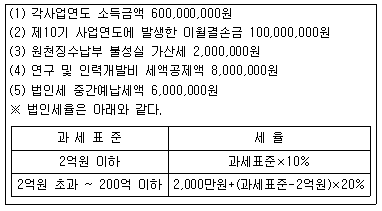 다음은 중소기업인 (주)한공의 제11기(2021.1.1.~2021.12.31.)에 대한 세무자료이다. 법인세 자진납부할 세액은 얼마인가? (단, 분납은 신청하지 않는 것으로 한다)