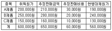 다음은 (주)한공의 2017년 12월 31일 재고자산 현황이다. 재고자산평가손실은 얼마인가? (각 제품은 서로 상이하고 관련이 없는 것으로 가정한다)