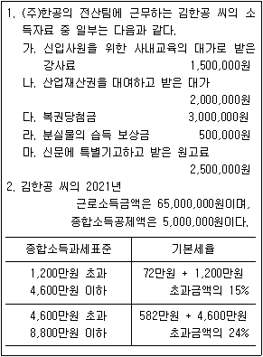 다음은 거주자 김한공 씨의 기타소득금액 관련 자료이다. 2021년 종합소득에 합산될 기타소득금액은 얼마인가? (단, 별도로 확인되는 필요경비는 없으며 세부담 최소화를 가정한다.)