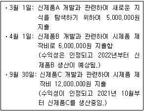 다음은 (주)한공의 2021년 연구개발 관련 지출 내역이다. 12월 31일 재무상태표에 무형자산으로 표시될 금액은 얼마인가? (무형자산의 내용년수는 5년, 잔존가치는 없으며 정액법에 의한 월할상각을 가정한다.)
