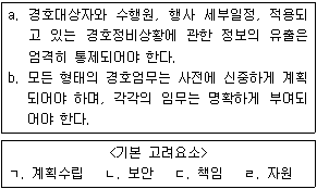 다음 <보기>는 경호작용의 기본 고려요소에 관한 설명이다. <보기>의 내용과 기본 고려요소와의 연결이 옳은 것은?