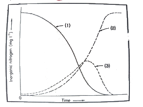 다음 그림은 순환여과식 양식장 내 질산화 과정 중 무기질소의 시간 경과에 다른 변화 형태이다. 번호순서대로 무기질소 형태를 나열한 것은?