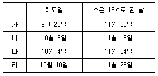 다음 표는 김의 채묘 일자와 수온이 13℃로 된 날을 기록한 것이다. 가장 흉작이 예상되는 것은?