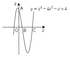 그림과 같이 삼차함수 y=x3-4x2-x+4의 그래프가 y축과 만나는 점을 A, x축과 만나는 점 중 x좌표가 양수인 점을 각각 B, C라 하자. 삼차함수 y=x3-ax2-x+4의 그래프 위의 점 P(a,b)가 점 A에서 출발하여 점 B를 거쳐 점 C까지 움직일 때, 2a-b의 최댓값과 최솟값의 합은?