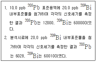 ICP-MS를 이용하여 음료수에 포함된 납의 농도를 납의 동위원소(208Pb)를 통해 분석할 수 있다. 음료수 시료 분석 과정과 결과가 아래와 같을 때, 시료의 208Pb의 농도(ppm)는?(문제 오류로 가답안 발표시 4번으로 발표되었지만 확정답안 발표시 모두 정답처리 되었습니다. 여기서는 가답안인 4번을 누르면 정답 처리 됩니다.)