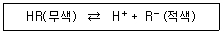 산-염기 적정에서 사용하는 지시약의 반응과 지시약의 형태에 따른 색상이 아래와 같다. 중성인 용액에 지시약과 산을 첨가하였을 때 혼합용액의 색깔은?