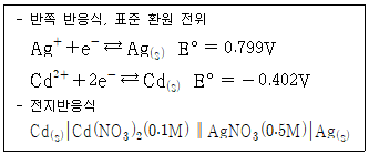 Ag 및 Cd와 관련된 반쪽 반응식과 표준 환원 전위가 아래와 같을 때, 25℃에서 다음 전지의 전위(V)는?