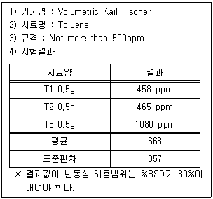 Volumetric Karl Fischer를 사용하여 실험한 결과가 아래와 같을 때, 실험 결과의 해석 및 일반적인 장비관리절차를 기준으로 적절하지 않은 의견을 제시한 사람은?