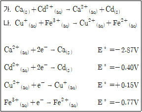 25°C의 수용액에서 반응이 자발적으로 일어나는지의 예측결과로 옳은 것은? (단, 용해된 화학종들의 초기농도는 모두 1.0M이라고 가정한다.) (문제 오류로 가답안 발표시 1번이 답안으로 발표되었으나, 확정답안 발표시 1번, 2번이 정답 처리 되었습니다. 여기서는 가답안인 1번을 누르면 정답 처리 됩니다.)