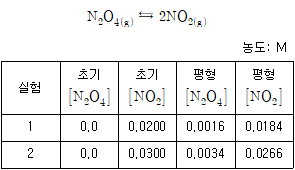 N2O4 NO2의 평형식과 실험 데이터가 아래와 같다. 데이터를 바탕으로 추론한 평형상수와 가장 가까운 값은?