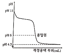어떤 산-염기 적정곡선이 아래와 같을 때, 적정물질을 가장 적절하게 설명한 것은?