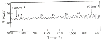폭이 매우 좁은 KBr셀 만을 적외선 분광기에 걸고 적외선 스펙트럼을 얻었다. 시료가 없기 때문에 적외선 흡수 밴드는 보이지 않고, 그림과 같이 파도 모양의 간섭파를 스펙트럼에 얻었다. 이 셀의 폭(mm)으로 가장 알맞은 것은?