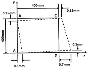 0.4m×0.4m인 정사각형 ABCD를 아래 그림에 나타내었다. 하중을 가한 후의 변형상태는 점선으로 나타내었다. 이때 A지점에서 전단 변형률 성분의 평균값(γxy)는?