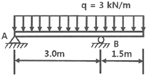 다음과 같은 길이 4.5m의 보에 분포하중 3kN/m가 작용된다. 이 보에 작용되는 굽힘 모멘트 절대값의 최대치는 약 몇 kNㆍm인가?