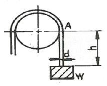 직경 20mm인 와이어 로프에 매달린 1000N의 중량물(W)이 낙하하고 있을 때, A점에서 갑자기 정지시키면 와이어 로프에 생기는 최대 응력은 약 몇 GPa인가? (단, 와이어 로프의 탄성계수 E=20GPa 이다.)