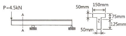 그림과 같은 T형 단면을 갖는 돌출보의 끝에 집중하중 P=4.5kN이 작용한다. 단면 A-A에서의 최대 전단응력은 약 몇 kPa인가? (단, 보의 단면2차 모멘트는 5313cm4이고, 밑면에서 도심까지의 거리는 125mm이다.)