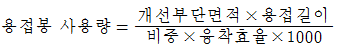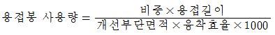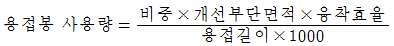 다음 중 용접봉 사용량을 산출하는 계산 공식으로 가장 적합한 것은? (단, 용접봉 사용량의 단위는 kgf, 개선부 단위면적의 단위는 cm2, 용접길의 단위는 ㎝, 융착효율의 단위는 % 이다.)