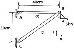 그림과 같은 트러스가 점 B에서 그림과 같은 방향으로 5kN의 힘을 받을 때 트러스에 저장되는 탄성에너지는 약 몇 kJ인가? (단, 트러스의 단면적은 1.2cm2, 탄성계수는 106Pa이다.)
