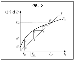 <보기>는 계자저항 2.5[Ω], 전기자저항 5[Ω]의 직류 분권발전기의 무부하 특성곡선에서 전압확립 과정을 나타낸다. 초기 전기자의 잔류자속에 의한 유도기전력 Er이 15[V]라면, 그림에서의 계자전류 If2는? (단, 계자의 턴수는 100턴, 계자전류 If1에 의한 계자자속 시간변화율은 0.075[Wb/sec]이다.)