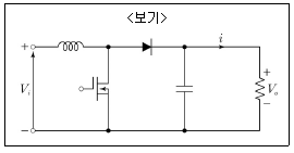 <보기>와 같이 DC-DC 컨버터의 듀티비가 D일 때, 출력전압은? (단, 인덕터 전류는 일정하며, 커패시터의 값은 출력전압의 리플을 무시할 수 있을 정도로 크다고 가정한다.)