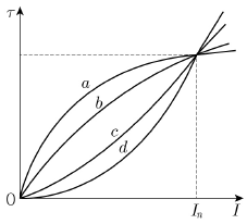 다음 그래프는 직류전동기들의 토크특성곡선을 나타내고 있다. 이 토크곡선 중 직류 가동복권전동기는? (단, I는 부하전류, τ는 토크를 나타낸다.)