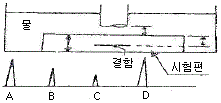 두께 2인치인 알루미늄 시험편을 수침법으로 검사하는 개략적인 그림과 스크린 상에 지시치가 나타난 도형을 이용하여 지시 A 와 B 사이의 거리를 옳게 나타낸 것은?