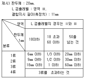 강 용접부의 초음파탐상 시험방법(KS B 0896)에 따른 다음 표를 이용하여 제시된 결함지시의 등급으로 옳은 것은?