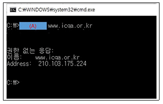 네트워크 및 서버관리자 Kim 사원은 ′www.icqa.or.kr′이라는 사이트를 도메인에 IP 등록을 하였다. 해당 IP가 제대로 도메인에 등록되었는지 확인하는 (A)에 들어가야 할 명령어는? (단. 윈도우 계열의 명령프롬프트(cmd)에서 실행하였다.)