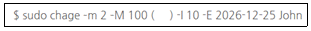Linux 시스템 관리자는 John 사원의 계정인 ′John′의 암호 정책을 변경하기 위해 아래 지문과 같이 입력하였다. 10일 전 암호 변경 경고를 위한 명령으로 ( )안에 알맞은 옵션은?