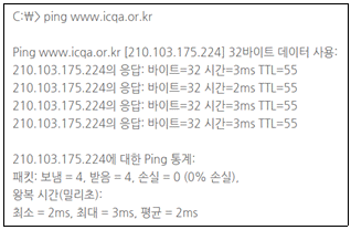 ping 명령어를 이용하여 목적지(www.icqa.or.kr)와 정상적으로 통신되었을 확인하였다.