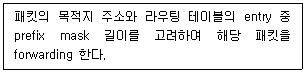 다음은 라우터의 경로 결정 시 routing table을 참조하여 패킷을 전달하는 과정에 대한 설명이다. 올바른 것은?