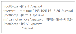 서버 관리자 Kim 사원이 Linux 서버의 ′/root′ 디렉터리를 점검하던 중 ′/etc/passwd′ 파일이 ′/root′ 디렉터리에 복사된 것을 발견했다. ′/root/passwd′ 파일을 삭제하려 했으나 삭제되지 않았다. (A) 명령어로 파일 속성을 확인한 결과, 해당 파일에 ′i′ 속성이 설정되어 쓰기 및 삭제가 불가한 것을 확인했다. 해당 명령어 (A)는?