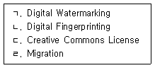디지털 환경에서 저작권 보호와 관리를 위한 개념 및 방법만을 모두 고르면?