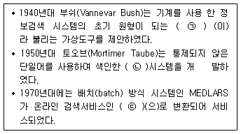 정보검색의 역사에서 ㉠~㉢에 들어갈 내용을 바르게 연결한 것은? (순서대로 ㉠, ㉡, ㉢)