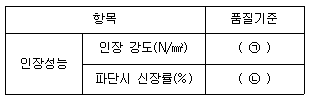 다음은 폴리우레아 수지 도막 방수재의 인장 성능 품질 기준이다. ( )안에 알맞은 것은?