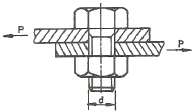 M22볼트(골지름 19.294mm)가 그림과 같이 2장의 강판을 고정하고 있다. 체결 볼트의 허용전단응력이 36.15MPa라 하면 최대 몇 kN까지의 하중(P)을 견딜 수 있는가?