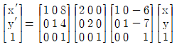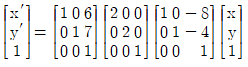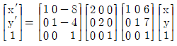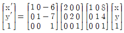 반지름 3, 중심점 (6, 7)인 원을 반지름 6, 중심점 (8, 4)의 원으로 변환하는 변환행렬로 알맞은 것은? (단, 변환 전과 후 원상의 점좌표는 동차좌표를 사용하여 각각
