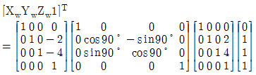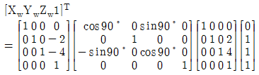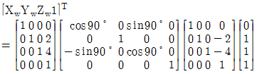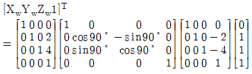 공간의 한 물체가 세계 좌표계의 x축에 평행하면서 세계좌표(0, 2, 4)를 통과하는 축에 관하여 90° 회전된다. 그 물체의 한 점이 모델 좌표 (0, 1, 1)을 가지는 경우, 회전 후에 같은 점의 세계 좌표를 구하는 식으로 적절한 것은?