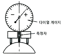 다음 그림과 같이 피측정물의 구면을 측정할 때 다이얼 게이지의 눈금이 0.5mm 움직이면 구면의 반지름(mm)은 얼마인가? (단, 다이얼 게이지 측정자로부터 구면계의 다리까지의 거리는 20 mm 이다.)