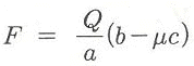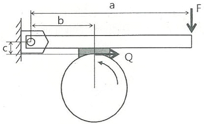 그림과 같은 블록 브레이크에서 막대 끝에 작용하는 조작력 F와 브레이크의 제동력 Q와의 관계식은? (단, 드럼은 반시계방향 회전을 하고 마찰계수는 μ이다.)
