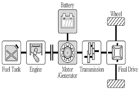 <보기>와 같은 구조를 갖는 하이브리드 자동차에 대한 설명으로 가장 옳지 않은 것은?