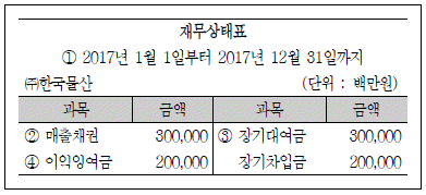 아래의 표는 ㈜한국물산의 2017년 재무상태표(계정식)를 나타낸 자료이다. 다음 중 가장 올바르게 작성된 부분은?