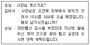상사가 9시 10분이 되었는데도 출근을 하지 않았다. 비가 많이 오기 때문에 상사가 늦으시는 것이라고 생각하고 있었다. 이 때 전화가 걸려왔다. 이렇게 통화를 마쳤는데, 상사가 건강상 이유로 오늘은 출근하지 않겠다고 연락이 왔다. 이럴 때 김 비서의 업무 처리 방법으로 가장 적절한 것은?