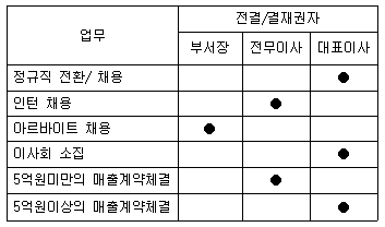 다음 중 아래의 위임전결표에 따른 결재 중 가장 올바르지 않게 처리된 것은?