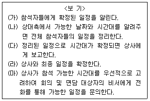 다음은 상사의 회의 일정을 확정하고자 할 때 일반적으로 비서가 수행하는 절차이다. <보기>에 제시한 일정 확인 절차를 순서대로 바르게 나열한 것은?
