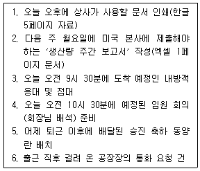 다음은 오늘(금요일) 처리하여야 할 비서의 업무이다. 업무 순서로 가장 적절한 것은?