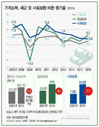 다음은 그래프는 가계소득, 세금 및 사회보험 비용 증가율에 대한 그래프이다. 이 그래프를 통하여 알 수 있는 것은?