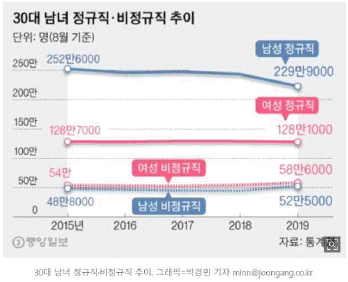다음 그래프는 30대 남녀 정규직, 비정규직 추이를 나타낸 그래프이다. 이 그래프에 대해 가장 적절하지 않은 분석은?